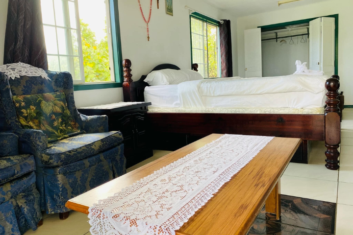 This roomy upstairs space features a double bed comfortably accommodating two people. The bathroom is shared with one other room and is located just upstairs. While there's no air conditioning, a fan is provided to keep you cool. Perfect for a cozy and comfortable stay!